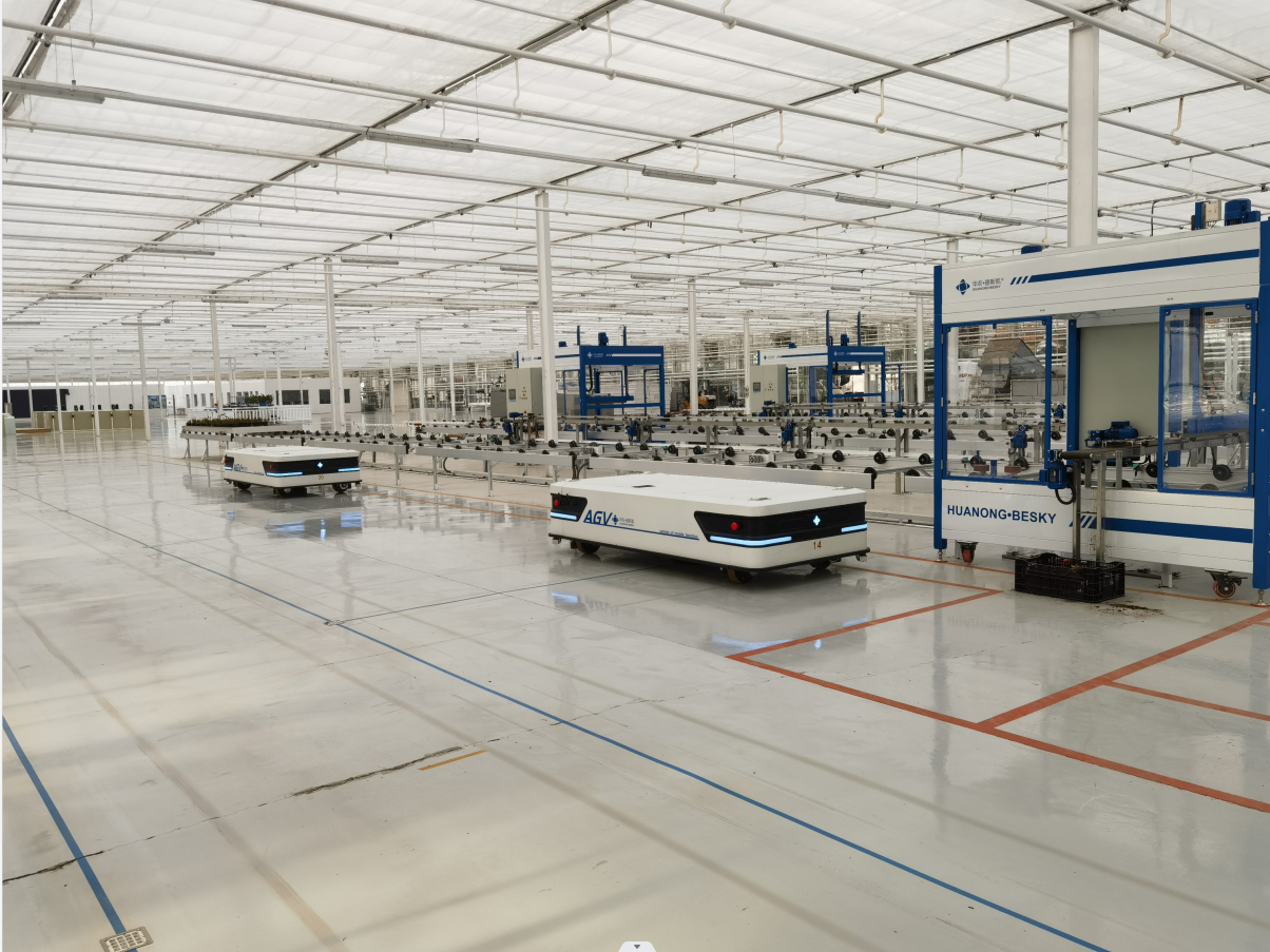 天津东信花卉有限公司是全国现代设施农业建设联盟单位,拥有智能玻璃温室55公顷,薄膜温室6公顷,种植宝莲灯、竹竽、蝴蝶兰等中高档特色花卉,是我国单体面积最大的玻璃温室。张辉院长一行对组培车间、自动化生产设备、水肥和灌溉工艺等现代设施农业装备的应用情况进行了详细了解。我院设施农业研究所和华农公司是该项目的长期技术支撑单位,其自主研发的AGV智能生产系统等国产化设施装备在温室中穿梭运行,展示出高度工厂化的生产场景。