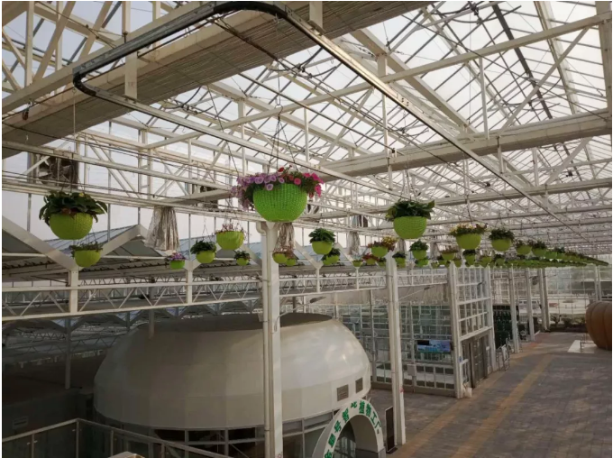 值得关注的是,温室内配套了先进的自动化物流系统、潮汐灌溉施肥系统、空中悬挂展示系统及立体升降栽培系统等四大系统均由华农提供。而这些势必会在未来智能化、高效化温室中发挥重要的作用。