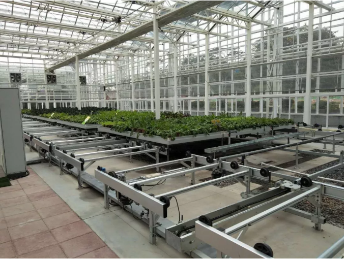 自动物流系统为国际上较先进的温室苗床种植模式。该项目系统由华农公司自主研发设计,分为两大区域。一个是存储区,位于物流系统的中间区域,其主要用于苗床的停放,以提供给苗床上的植物吸收光照、肥水和温湿度控制等促进植物生长;另一个是转运区,转运区位于存储区两侧,以轮式线为基础,在实际工作过程中,各列苗床可通过转运区进行调度和转运。系统可通过触摸屏现场控制转运次序,也可在集中控制室通过上位机软件进行调度和智能管理,来实现苗床在温室内的自动运输。从而大大节约了人力成本和管理难度,此模式得到广泛认可。