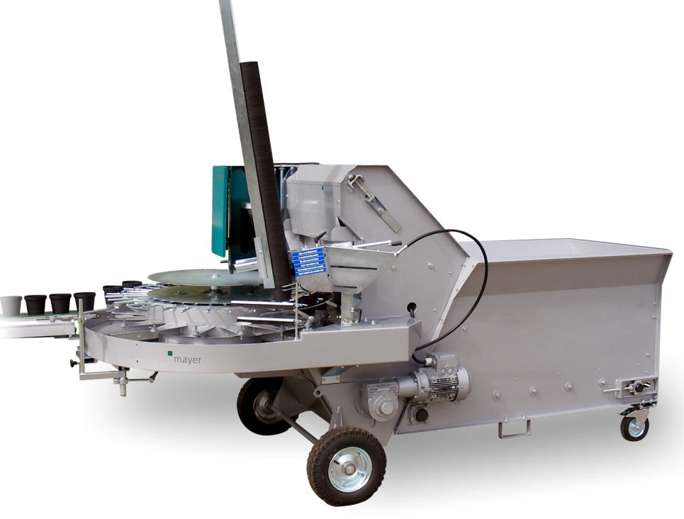 TM1810型装盆机具有16个花盆位置的大转台,为工人提供了移栽操作操作站位,花盆输出传送带可以定位在半圆范围内的任意一个花盆位置,输出花盆位置灵活。
