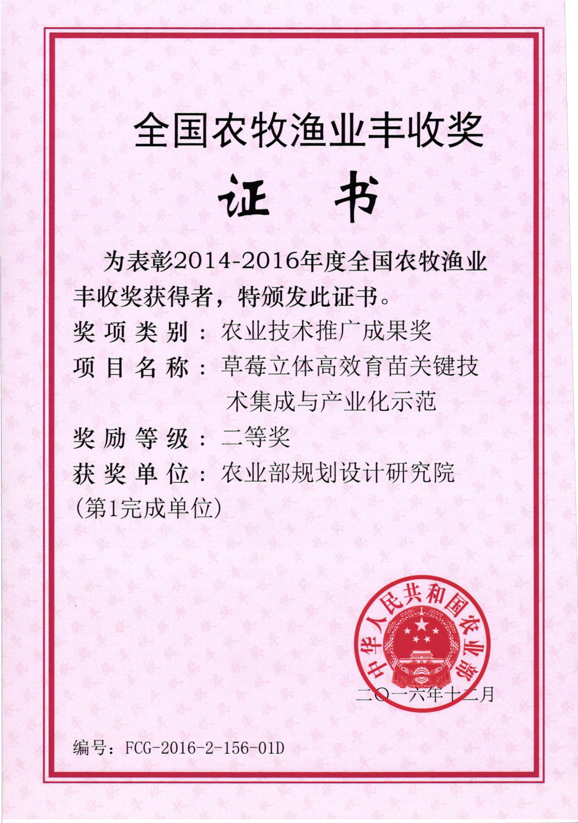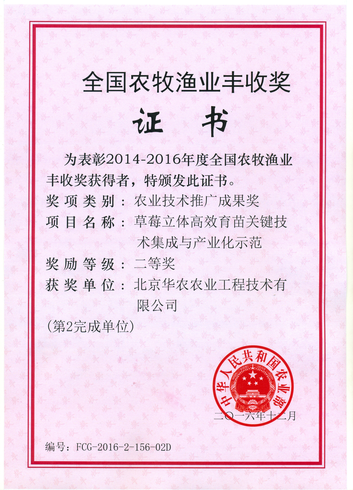 三年评选一次的“全国农牧渔业丰收奖”于2016年12月揭榜并颁发获奖证书,我公司参与的草莓高架育苗设备荣获二等奖,此奖项是农业部授予在基层农业技术推广一线做出创造性突出贡献的农业科技人员或组织的荣誉。