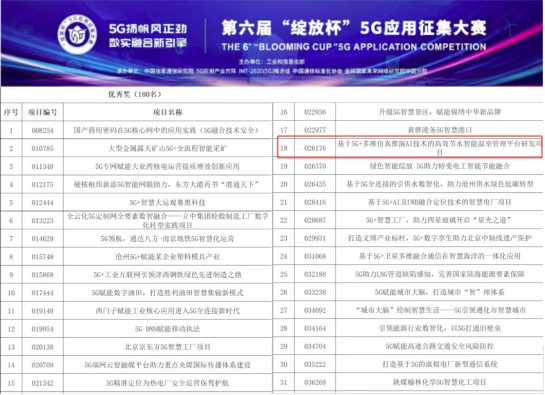 2023年10月18日,第六届“绽放杯”5G应用征集大赛全国总决赛在上海落下帷幕。由北京华农公司牵头,黑龙江联通、天津联通、天津东信等单位联合申报的《基于5G+多维仿真推演AI技术的高效节水智能温室管理平台研发项目》,从全国各行业45728个参赛项目中脱颖而出,荣获“5G+农业”专题赛一等奖和全国总决赛优秀奖。