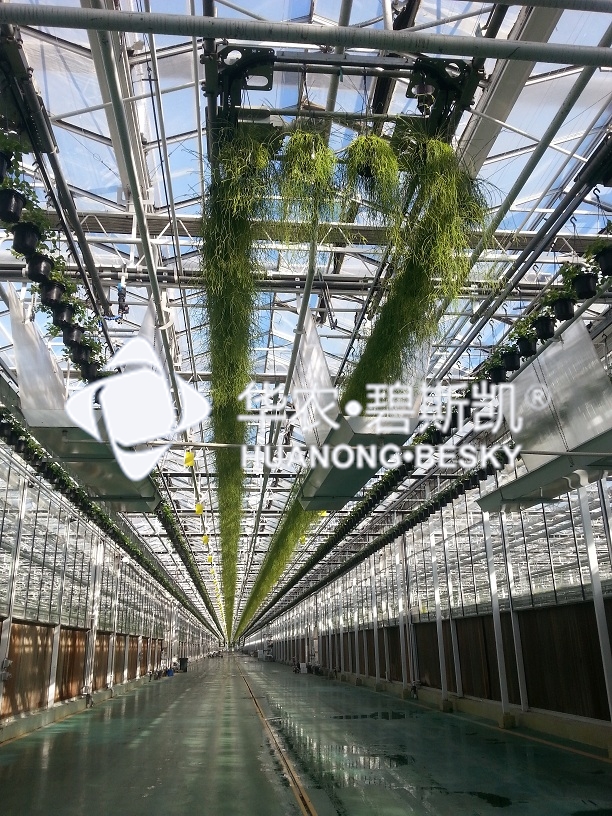 在天津滨海国际花卉科技园区安装使用的荷兰METAZET悬挂链系统。花盆悬挂在上面,自动循环旋转及浇水,给人以美的享受。